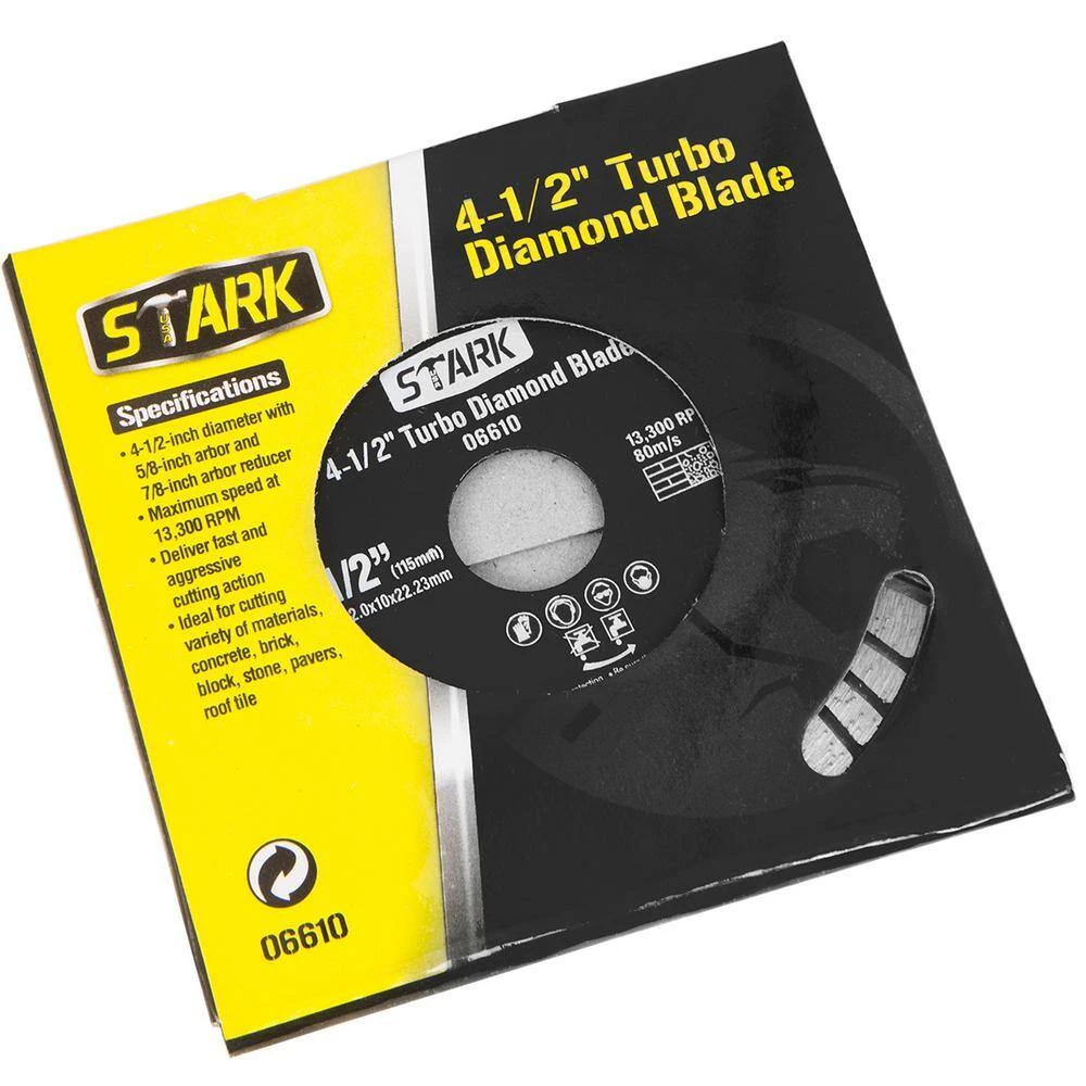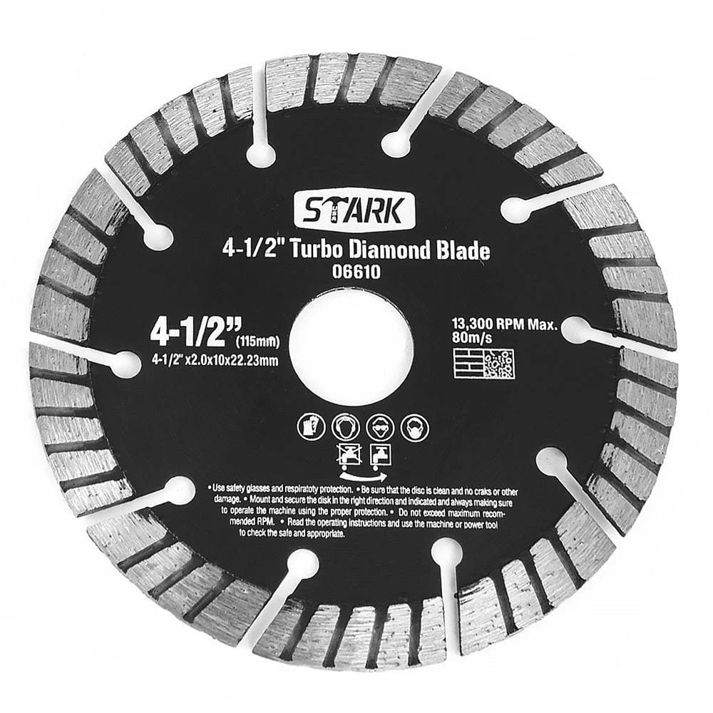 The Stark Turbo Diamond Blade provides the best cutting performance and long life for all of your DIY projects. These blades are engineered for maximum cutting performance and 3x longer life than standard abrasive blades. Use the turbo rim blade for fast and smooth cuts on concrete, brick, block, stone, and stucco. It’s also an excellent choice for roof tile and other masonry products. This blade will fit most small angle grinders.