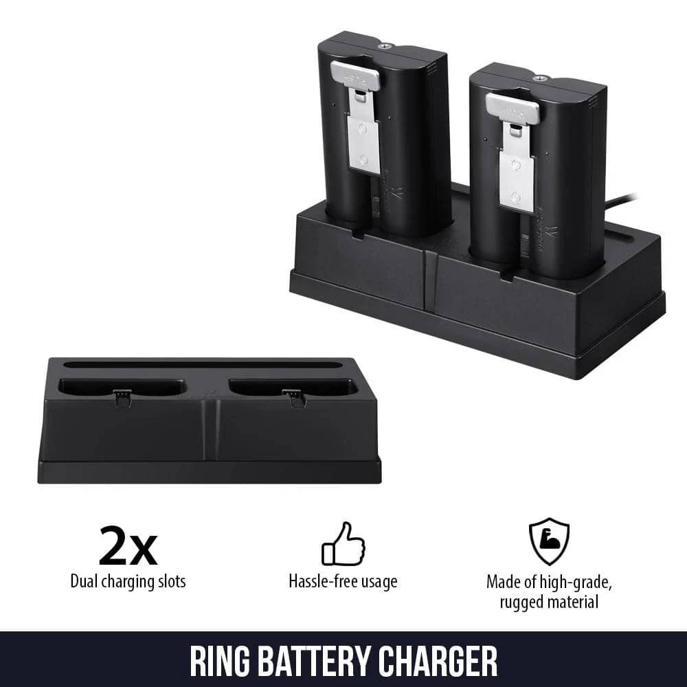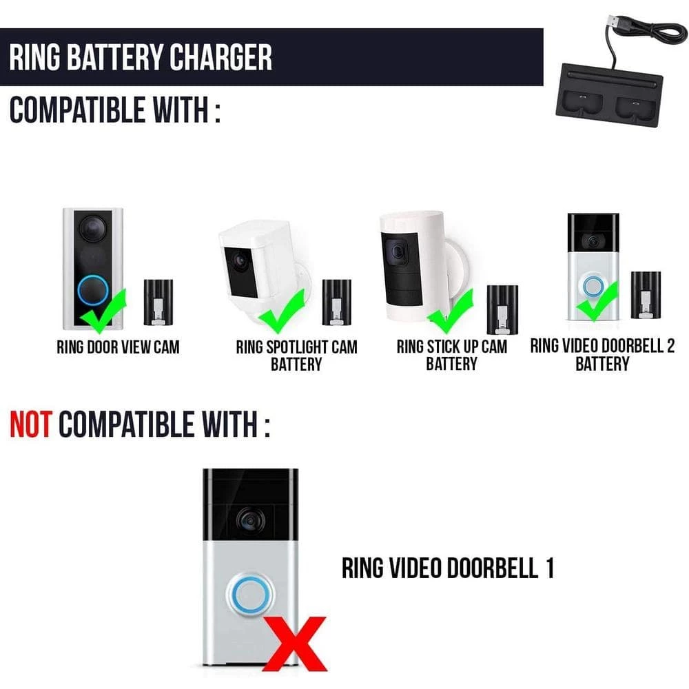 - WORKS WITH RING-COMPATIBLE BATTERIES – The Wasserstein Charging Station works with the rechargeable batteries of Ring Spotlight Cam Battery, Ring Video Doorbell 2, Ring Stick Up Cam Battery HD, and Ring Door View Cam.