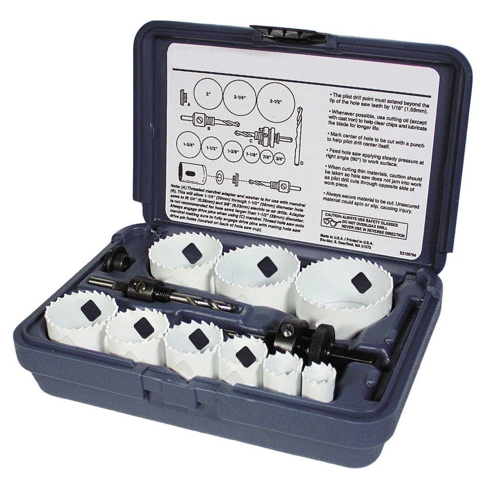 The BLU-MOL Xtreme Bi-Metal Hole Saw features a revolutionary design that increases visibility, accuracy and improves battery and machine life. Diamond-shaped sidewall cutouts increase visibility while large openings on the backing plate allow for quick removal of cut materials. The saw includes fleem ground teeth for longer life. Kit includes (2) mandrels, (1) mandrel adapter, (1) pilot drill and (1) of the following hole saws: 3/4 in. (19 mm), 7/8 in. (22 mm), 1-1/8 in. (29 mm) 1-3/8 in. (35 mm), 1-1/2 in. (38 mm), 1-3/4 in. (44 mm), 2 in. (51 mm), 2-1/4 in. (57 mm) and 2-1/2 in. (64 mm).