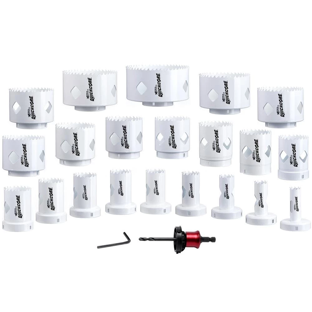 DISSTON BLU-MOL Xtreme QuickCore Hole Saws. Patented hole saw system that has up to 10X faster core ejection. Eliminates the #1 Issue with using a hole saw of core ejection. Quick change sleeve with and open back arbor allows for fast core removal. 1 Mandrel for all sizes. The wide Diamond slot and open back design allow for increase visibility and cooling while cutting. The QuickCore design allows for immediate plug removal with no need for added tools. All sizes of hole saws available.
