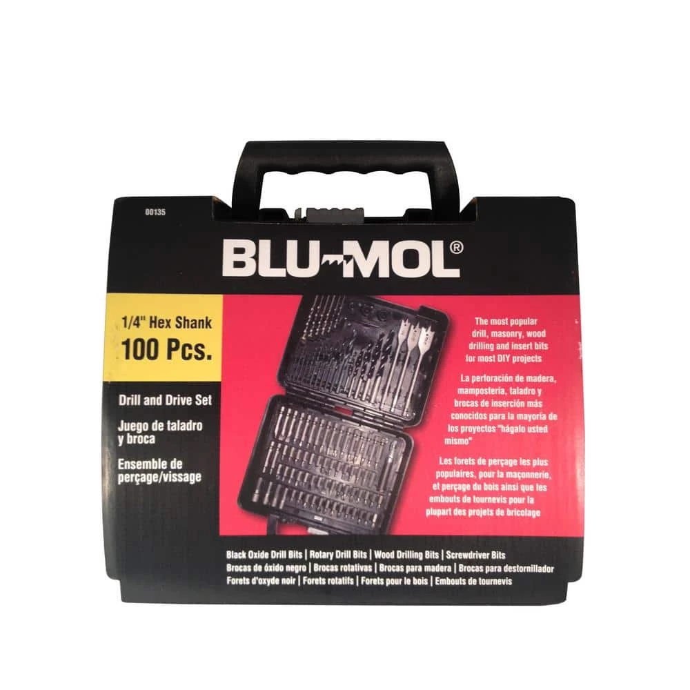 This 100-Piece drill bit kit comes with the standard bits used in most household projects. The set includes carbide tipped rotary masonry drill bits: 1/8 in., 5/32 in., 11/64 in., 3/16 in., 7/32 in., 1/4 in., drill Stops: 3/16 in., 5/16 in., 3/8 in., allen key, spade bits: 1/2 in., 5/8 in., 3/4 in., brad point bits: 1/8 in., 3/16 in., 1/4 in., 5/16 in., 3/8 in., black oxide drills: 1/16 in.-2, 5/64 in. – 2, 3/32 in., 7/64 in., 1/8 in., 9/64 in., 5/32 in., 3/16 in., 1/4 in., 2 in. power bits: P1-2, P2-5, P3-2, Sl618, Sl8-10, Sl10-12, Sq1, Sq2-2, Sq3, 5/32 in., 7/64 in., stubby screw guide, 1 in. insert bits: P1-2, P2-15, P3-2, Sl3-4, Sl6-8, Sl8-10-2, Sl10-12, Sq1-2, Sq2-5, Sq3-2, 1/16 in., 5/64 in., 3/32 in., 1/8 in., 9/64 in., 7/32 in., 1/4 in., 3/16 in., 5/32 in., 7/64 in. and magnetic nutdrivers: 5/32 in., 3/16 in. – 2, 7/32 in., 1/4 in. – 2, 9/32 in. and 5/16 in. Make quick work of any fastener project. Blu-Mol driving bits, sets, adaptors and guides handle a wide variety of tough jobs. Blu-Mol fasteners are hardened and tempered for longer life.