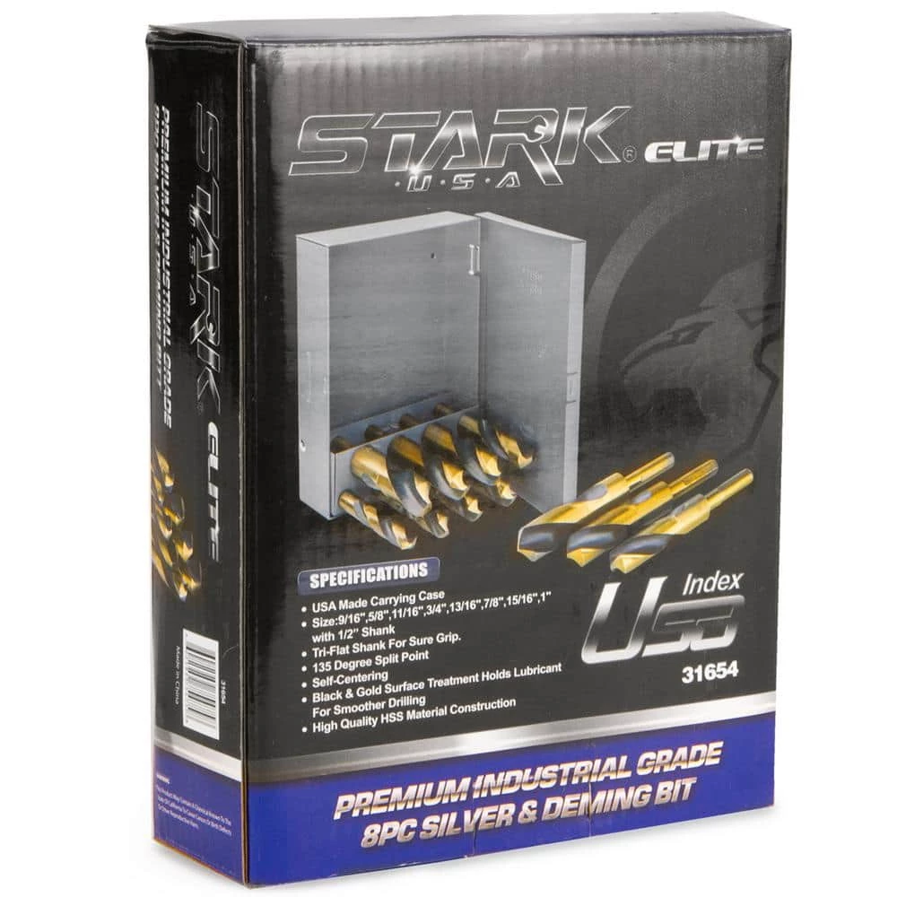 The stark ELITE Silver and Deming Drill Bit Set features a 8-piece industrial grade collection of S and D drill bits to accommodate the needs of professionals and DIY handymen. Each of our bits are individually engineered with premium quality high speed steel and titanium coating by undergoing heat treatment and machine engineered to have superior strength and durability for hard metal application. The secure grip 3-flat shank prevents slipping and walking to drill precise and accurate holes. Each bit features a 135° split point to deliver faster penetration with less pressure for an enhanced hole-drilling experience. This S and D drill bit set is ideal for drilling a broad range of materials from wood, plastic, aluminum and metal. In addition, this drill bit set comes with a metal carrying case with handle for easy transportation and secure storage.