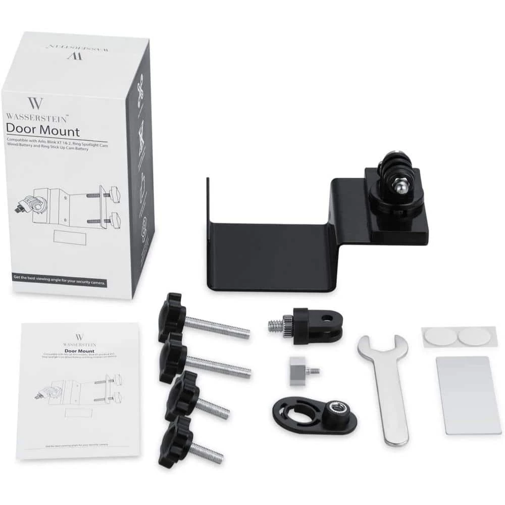 - Package includes – 1 x door mount, 1 x steel plate, 1 x adhesive sticker, 1 x wrench, 1 x mounting screw for ring spotlight cam battery, 1 x mounting adapter for blink outdoor/blink XT2