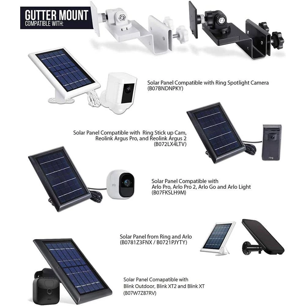 - 1 gutter mount that fits all- the Wasserstein gutter mount works seamlessly with our solar panel compatible with the ring spotlight camera, ring stick up cam, reolink argus pro, reolink argus 2, Arlo pro, Arlo pro 2, Arlo GO, Arlo light, blink outdoor, blink XT2 and blink XT, it is also compatible with the ring and Arlo versions of solar panel