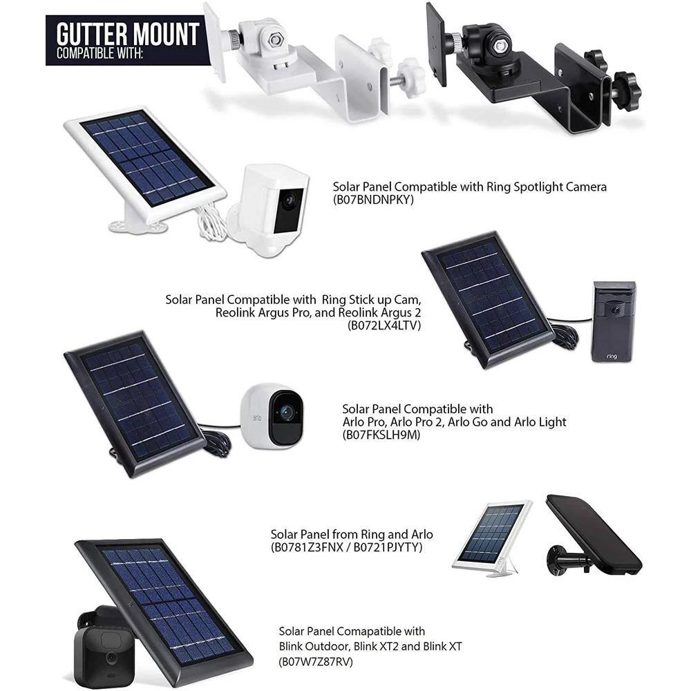 - 1 gutter mount that fits all – the Wasserstein gutter mount works seamlessly with our solar panel compatible with the ring spotlight camera, ring stick up cam, reolink argus pro, reolink argus 2, Arlo pro, Arlo pro 2, Arlo go, Arlo light, blink outdoor, blink XT2 and blink XT, it is also compatible with the ring and Arlo versions of solar panel