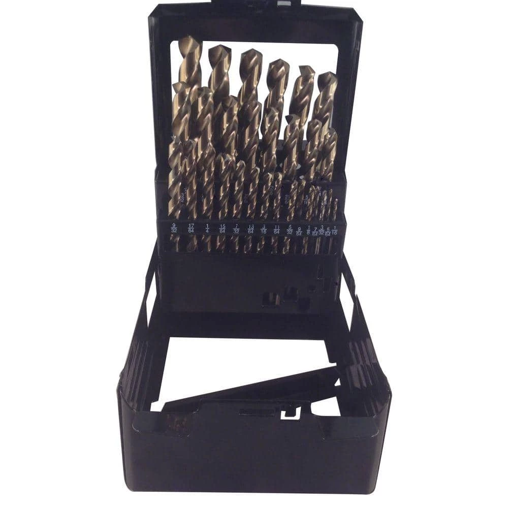 Cobalt M35 drill bits provide superior specialized performance. These bits are needed for extreme high heat encountered with drilling in hard metal, heat-treated steel and stainless steel. Set contains (1) of the following drill sizes: 1/16 in., 5/64 in., 3/32 in., 7/64 in., 1/8 in., 9/64 in., 5/32 in., 11/64 in., 3/16 in., 13/64 in., 7/32 in., 15/64 in., 1/4 in., 17/64 in., 9/32 in., 19/64 in., 5/16 in., 21/64 in., 11/32 in., 23/64 in., 3/8 in., 25/64 in., 13/32 in., 27/64 in., 7/16 in., 29/64 in., 15/32 in., 31/64 in., and 1/2 in. Metal index case. (Drill bits 25/64 in. and above feature 3/8 in. Reduced Shank).